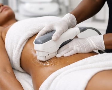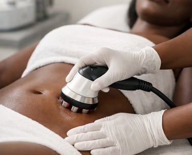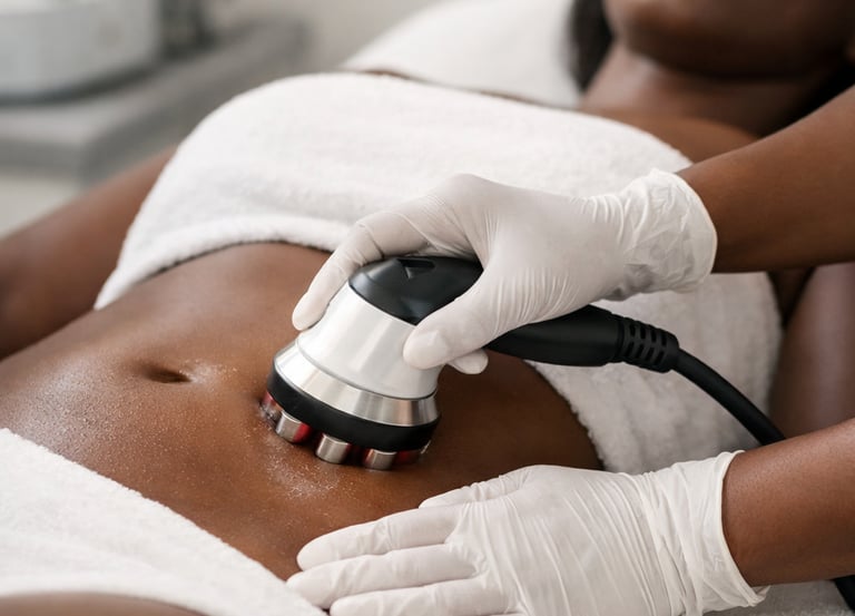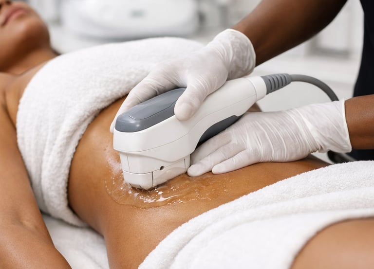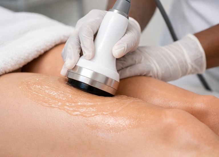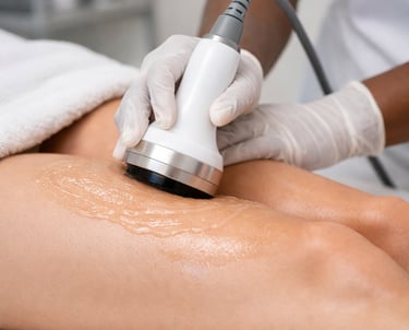 Ultrassom que rompe células de gordura, facilitando a redução de medidas.